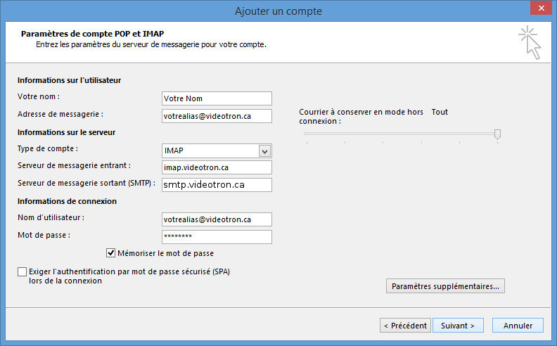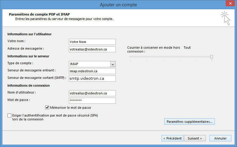 Dans le champ Serveur de courrier entrant : indiquez imap.votrenomdedomaine.com en minuscules et sans accent.